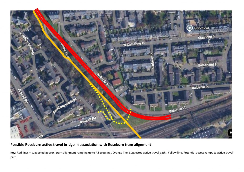 - The sketch below shows a possible alignment. The dotted yellow path would probably not be necessary, as most people would remain at high level, whilst people needing local access could use the ramp at Sauchiebank (to the new path) or at Roseburn.