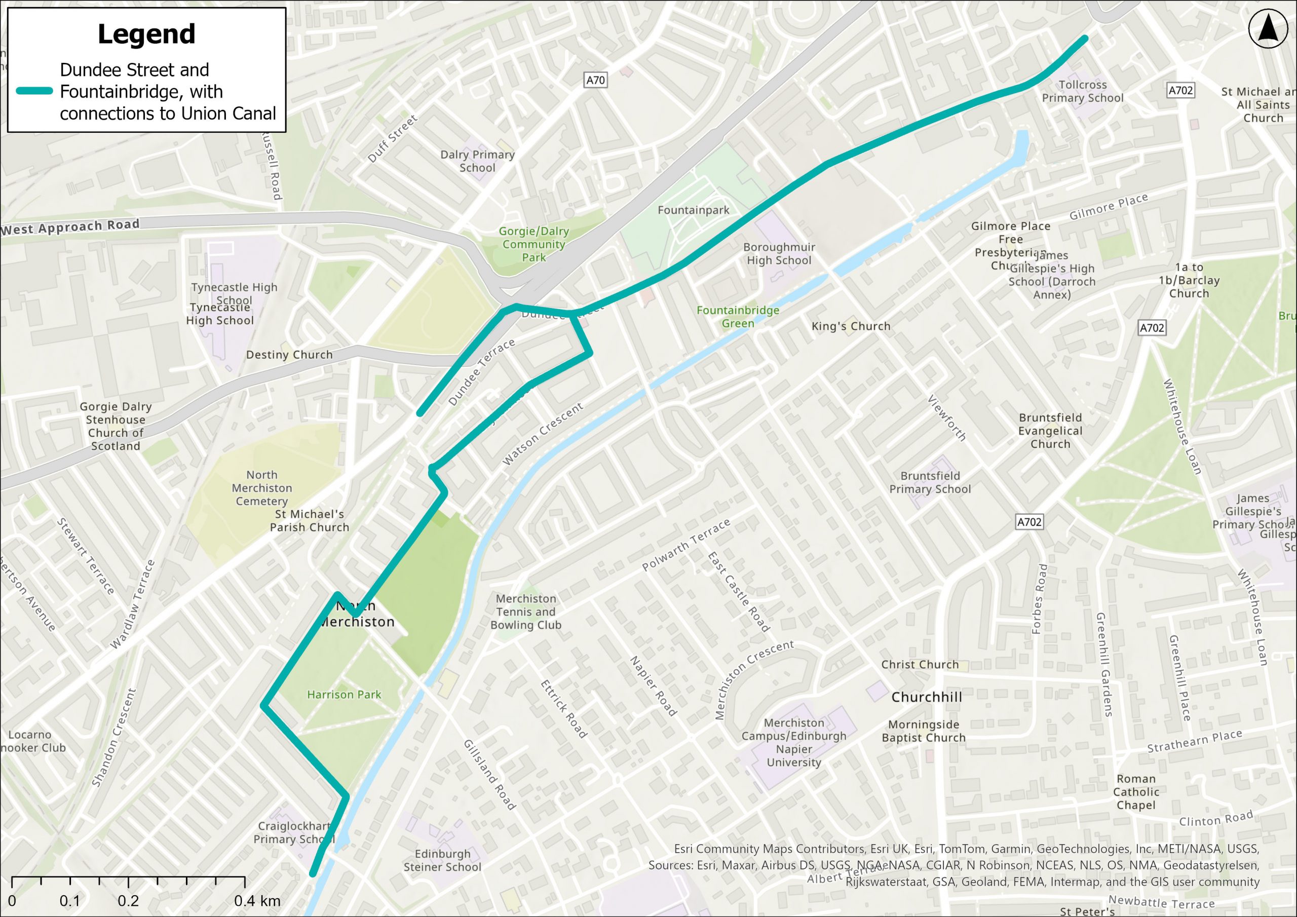 2510 Dundee Street Fountainbridge Active Travel Project bike lanes & other AT improvements along Dundee Street, Fountainbridge, and streets connecting to the Union Canal – intention to reduce pressure on the canal towpath / consultation page / proposals maps (23MB) / area map / Spokes response /